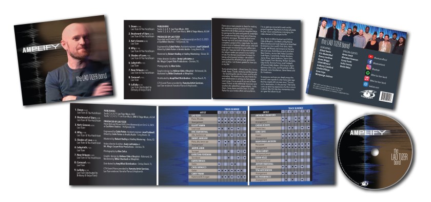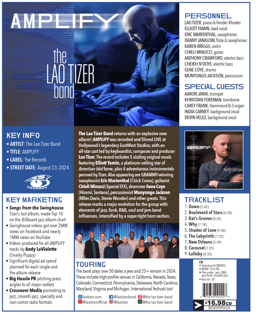 For his 2024 album release, called Amplify, LA-based keyboardist Lao Tizer wanted a bold new approach to CD packaging that would let him easily share the spotlight with roughly 25 other project participants. Morphist developed a grid system to efficiently organize all performance and arrangement credits. We also produced a 1-sheet (shown further below) to provide key marketing data throughout the distribution system.