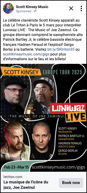 Advertising Scott Kinsey We’ve produced various forms of print and digital advertising for Scott’s albums and concert tours. In some cases we translate marketing copy into the local language, as in these examples from Scott’s most recent “Luniwaz LIVE” tour.