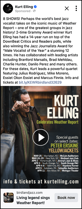 For every market we produce at least two static flyer ads and one or two video ads, with ticket buy links to the venue event pages. Here are two samples as they appeared in Facebook and Instagram feeds. We’ve driven over 26,000 clicks for these tours thus far.