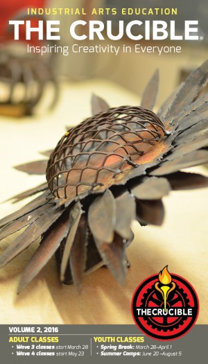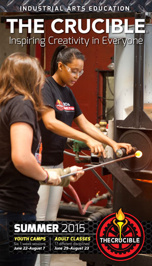 Bold quarterly catalogs placed industrial arts education into the larger context of The Crucible’s mission and history. Course descriptions cover 20 different departments, including welding, glass blowing, ceramics, blacksmithing, jewelry, woodworking, leather, neon, robotics and many other disciplines. Click each image to view 40-page catalog pdfs, designed with great precision by Stephen Bissinger.