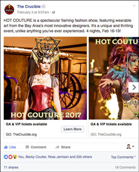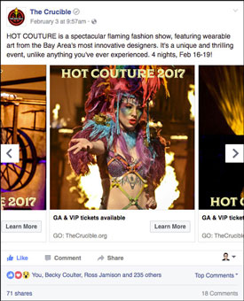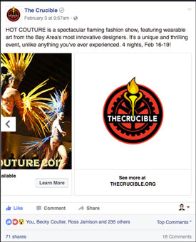 Morphist developed several campaigns to promote The Crucible’s classes and events on Facebook, Instagram and Twitter. We utilized a 6-slide carousel ad format, allowing the user to quickly swipe through several images and copy points. These efforts typically generated tens of thousands of clicks, with cost-per-click (CPC) as low as 14 cents. This ad was one element of the Hot Couture 2017 marketing campaign, helping drive ticket sales up +48% versus 2016 and up +87% versus the 2015 event.